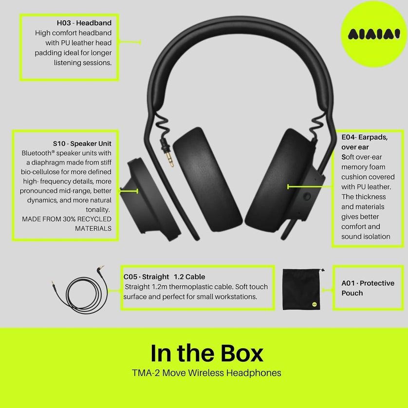 Los nuevos Auriculares AiAiAi TMA-2 Move Wireless de segunda generación cuentan con un avanzado chip Bluetooth Bluetooth 5.0 con y producen más de 40 horas de reproducción inalámbrica a través de sus poderosas bocinas con diafragma de BioCelulosa.