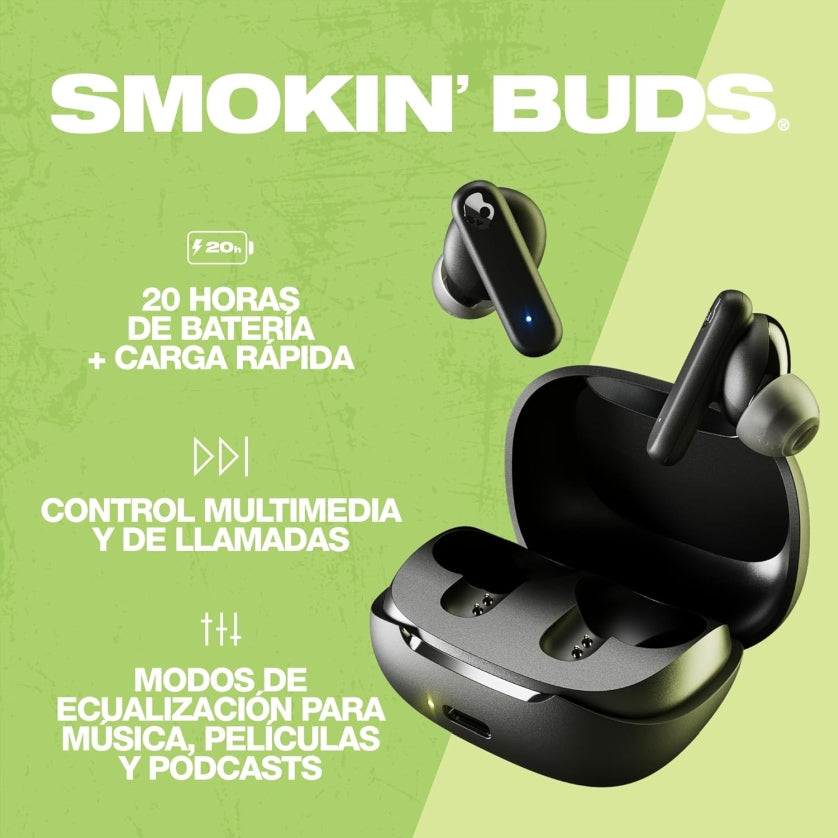 Nuevos Skullcandy Smokin Buds True Wireless; Sonido inigualable: entrena, relájate o sal a patinar con tus canciones favoritas. No te pierdas ningún detalle y disfruta de los bajos ¡a TOPE! Cada auricular dispone de un micrófono para poder llevar solo 1 puesto, así podrás llamar y escuchar el sonido de tu alrededor al mismo tiempo.