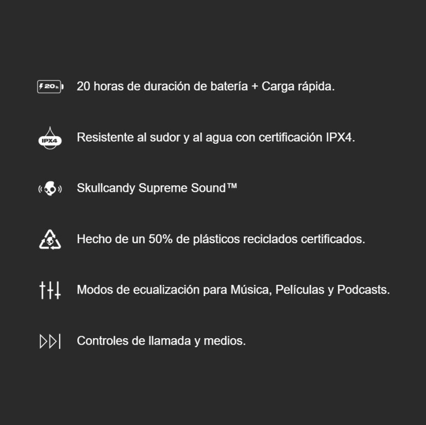 Los nuevos Skullcandy Smokin Buds están hechos con 50% de plástico renovable lo que significa que son producidos a partir de materiales biodegradables o de origen biológico. Además, el embalaje que Skullcandy usa para todos sus productos es 100 % reciclable.