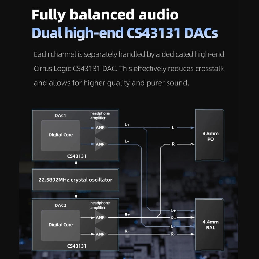 El BTR13 cuenta con un Cirrus Logic CS43131 DAC de gama alta para cada canal, con un DAC dedicado al procesamiento de cada canal estéreo. Esta configuración reduce eficazmente la diafonía y reproduce fielmente el audio, lo que le permite disfrutar de una experiencia de sonido más pura.