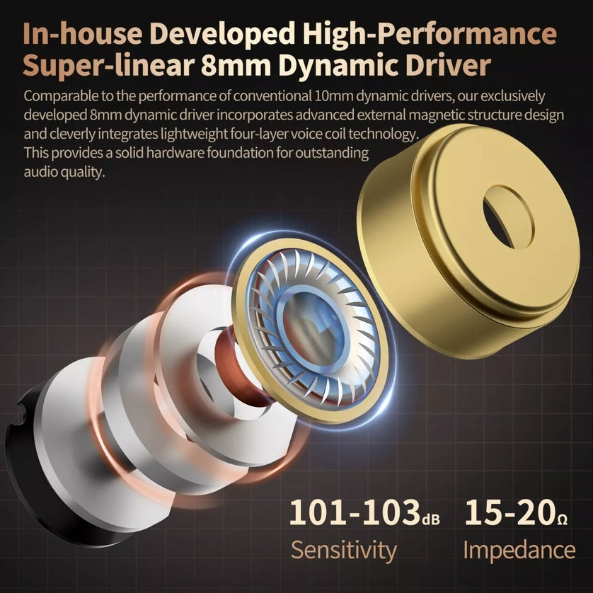 El controlador dinámico triple de 8 mm de los Vader, ha sido desarrollado internamente y rivaliza con el rendimiento de los controladores más grandes de 10 mm. Con un diseño avanzado de estructura magnética externa y una tecnología liviana de bobina móvil de cuatro capas, sienta las bases para una calidad de audio excepcional.