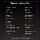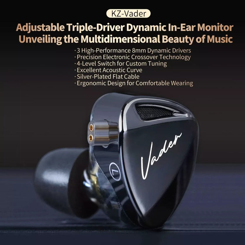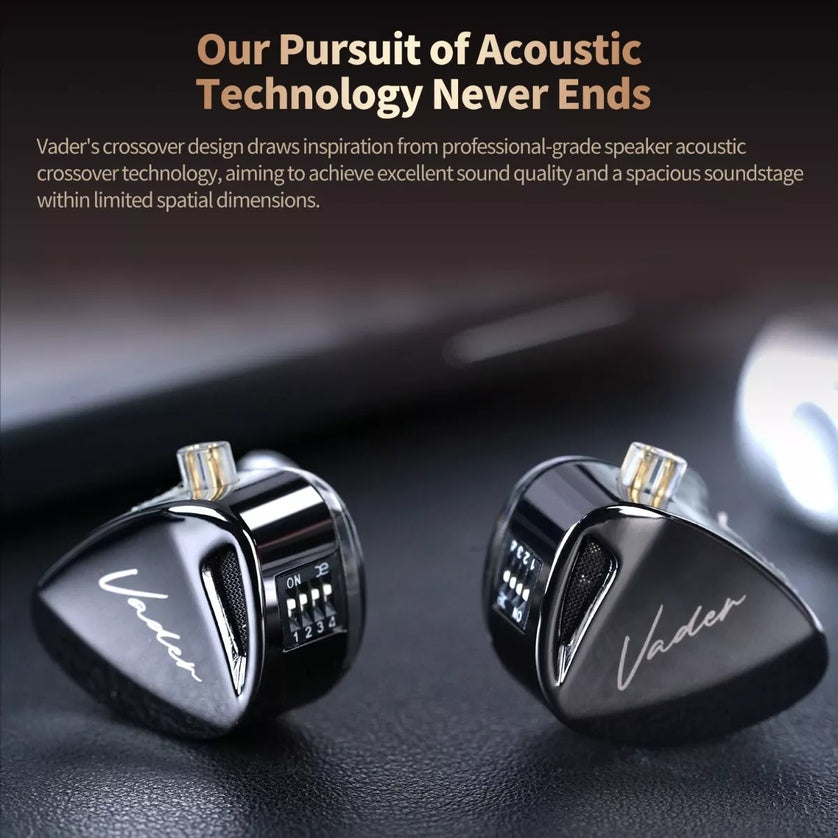 Los auriculares tradicionales con un solo controlador dinámico a menudo tienen dificultades para equilibrar la claridad y el impacto en las frecuencias graves. Sin embargo, Vader se niega a ceder, logrando un equilibrio perfecto entre los dos, estableciendo un nuevo estándar en calidad de sonido. Inspirado en la tecnología de cruce acústico de altavoces con el objetivo ofrecer una calidad de sonido excepcional y un escenario sonoro espacioso dentro de un factor de forma compacto.