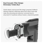 El diseño de filtro acústico dual reduce eficazmente el valor Q de las notas ultra altas, eliminando así las sibilancias de timbre que se encuentran comúnmente en los auriculares de alta fidelidad de nivel básico sin comprometer los detalles.