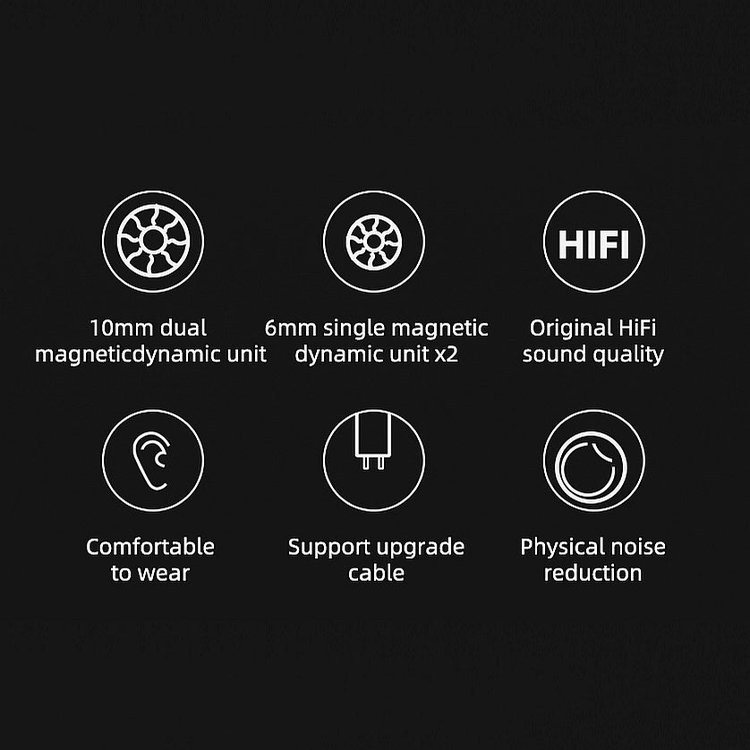 Los nuevos KZ DQ6 integran una arquitectura única de 3 drivers dinámicos por lado, con un driver maestro de 10mm de diámetro que se encarga de las frecuencias sub-bajas (Sub-Woofer) y dos drivers dinámicos de 6mm posicionados en tandem para una espectacular reproducción de las frecuencias medias y altas.