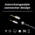 El cable de los Juzear Defiant está equipado con conectores de dos pines de 0.78mm rematados en su otro extremo por un conector tipo plug de puntas intercambiables de 3.5mm y 4.4mm para audio balanceado lo que lo hace compatible con una variedad de dispositivos, desde smartphones hasta reproductores de audio digitales de alta resolución.