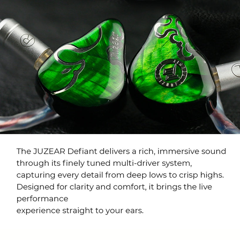 Los nuevos JUZEAR Defiant son audífonos monitor con tecnología híbrida conformada por un array de 4 drivers siendo el driver principal de tipo dinámico de 10mm de diámetro y con membranas de Carbon Diamante para una perfecta reproducción de las frecuencias bajas las cuales alcanzan una profundiad de hasta 5 Hz; por otro lado los 3 drivers restantes son de Armadura Balanceada y están controlados por un crossover electrónico que separa las frecuencias medias y altas en 3 rangos dónde cada uno de ellos es reproducido de manera individual e impecable por estos 3 drivers.