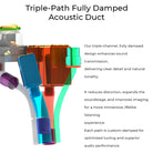 Los Juzear Defiant cuentan con un sistema acústico patentado de tres conductos donde cada rango de frecuencias (bajas, medias y altas) es conducido de manera independiente al oído a traves de cada uno de estos conductos. De esta manera la separación instrumental es impecable y se reduce la distorsión armónica prácticamente a cero.