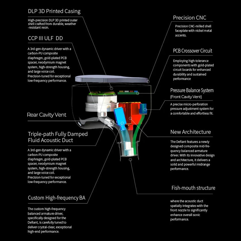 Los nuevos JUZEAR Defiant son audífonos monitor con tecnología híbrida conformada por un array de 4 drivers siendo el driver principal de tipo dinámico de 10mm de diámetro y con membranas de Carbon Diamante para una perfecta reproducción de las frecuencias bajas las cuales alcanzan una profundiad de hasta 5 Hz; por otro lado los 3 drivers restantes son de Armadura Balanceada y están controlados por un crossover electrónico que separa las frecuencias medias y altas en 3 rangos dónde cada uno de ellos es reproducido de manera individual e impecable por estos 3 drivers.