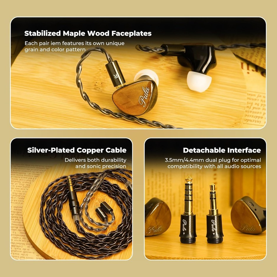 Los IEMs Pula Unicrom están diseñados para un rendimiento puro y lo demuestra su construcción hecha con madera de arce estabilizada que en comparación con otras maderas ofrece una estructura más densa y un excelente control de resonancia, ayudando a suprimir las vibraciones no deseadas dentro de la cavidad y ofrecer un sonido cálido y transparente. Al mismo tiempo, cada par de los PULA UNICROM cuenta con su propio patrón único de grano y color, haciendo de cada Unicrom una verdadera pieza única.