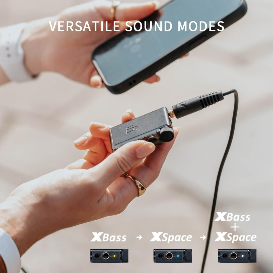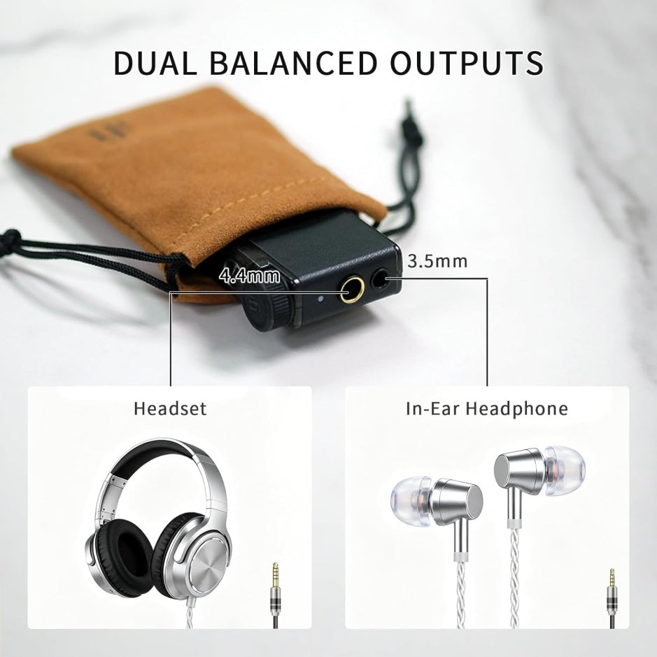 Para recibir la señal inalámbrica, utiliza un chipset Qualcomm QCC5144 dedicado exclusivamente a esa tarea. Luego, el audio pasa a un DAC Cirrus Logic MasterHIFI, cuidadosamente seleccionado por su tonalidad natural, bajo consumo y excelente capacidad de resolución. Finalmente, una etapa de amplificación en modo twin-mono entrega hasta 256 mW de potencia limpia, suficiente para auriculares de gama media y alta, con salidas balanceadas de 4,4 mm y una salida S-Balanced de 3,5 mm que reduce diafonía en IEMs sensibles.