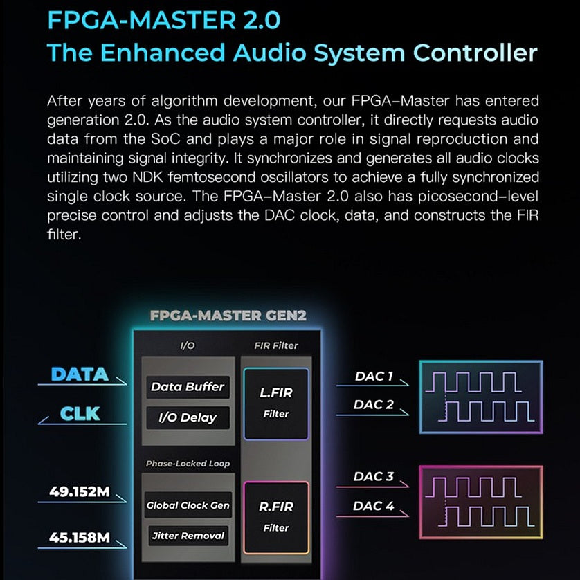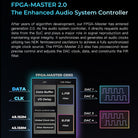 Después de años de desarrollo de algoritmos, nuestro FPGA-Master ha entrado en la generación 2.0. Como controlador del sistema de audio, solicita directamente datos de audio del SoC y desempeña un papel importante en la reproducción de la señal y en el mantenimiento de su integridad. Sincroniza y genera todos los relojes de audio utilizando dos osciladores de femtosegundos NDK para lograr una fuente de reloj única totalmente sincronizada. El FPGA-Master 2.0 también tiene un control preciso a nivel de picosegundos y ajusta el reloj y los datos del DAC y construye el filtro FIR.