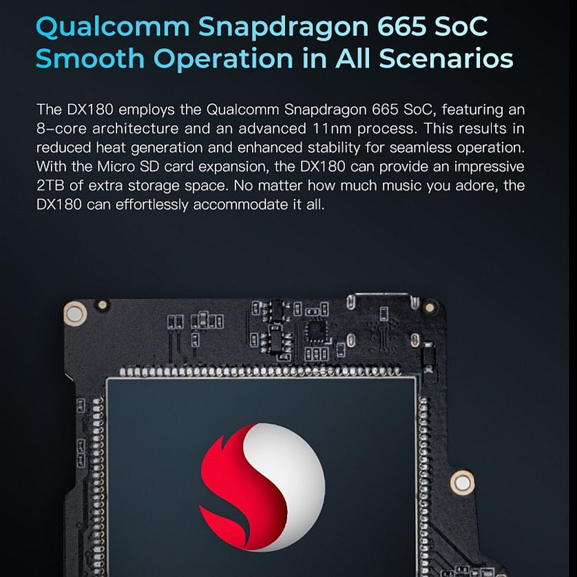 El DX180 emplea el SoC Qualcomm Snapdragon 665, con una arquitectura de 8 núcleos y un proceso avanzado de 11 nm. Esto da como resultado una menor generación de calor y una mayor estabilidad para un funcionamiento perfecto. Con la expansión de la tarjeta Micro SD, el DX180 puede proporcionar unos impresionantes 2 TB de espacio de almacenamiento adicional. No importa cuánta música te guste, el DX180 puede acomodarlo todo sin esfuerzo.