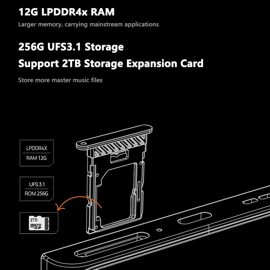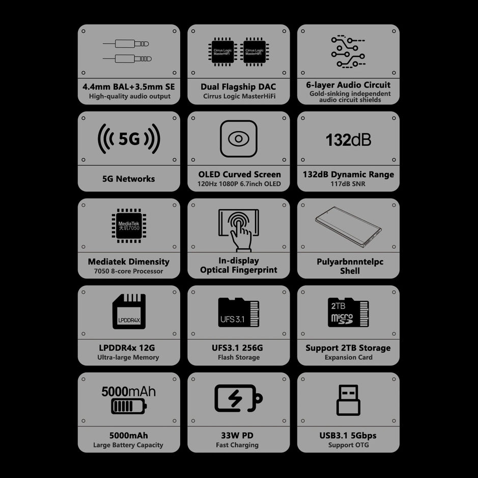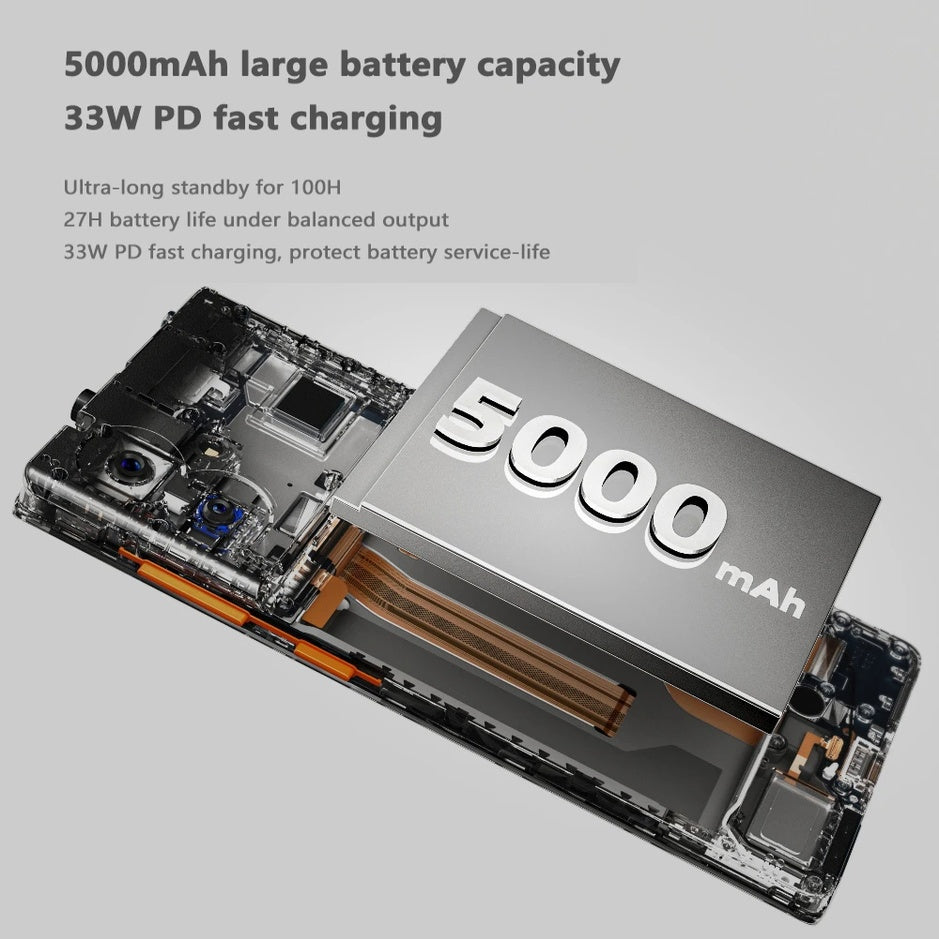 En lo que respecta a su naturaleza como Smartphone, el Moondrop MIAD01 está basado en Android 13, viene equipado con un procesador octa-core Mediatek 7050, 12 GB de RAM LPDDR4X y 256 GB de almacenamiento interno UFS3.1. lo que proporciona una interfaz de usuario fluida y sin demoras, lista para ejecutar diferentes aplicaciones, tareas avanzadas, música en streaming, contenidos multimedia, así como videojuegos y todo esto en un entorno de audio de alta resolución. Cuenta con Bluetooth 5.4 compatible con codecs de alta resolución tales como LDAC.
